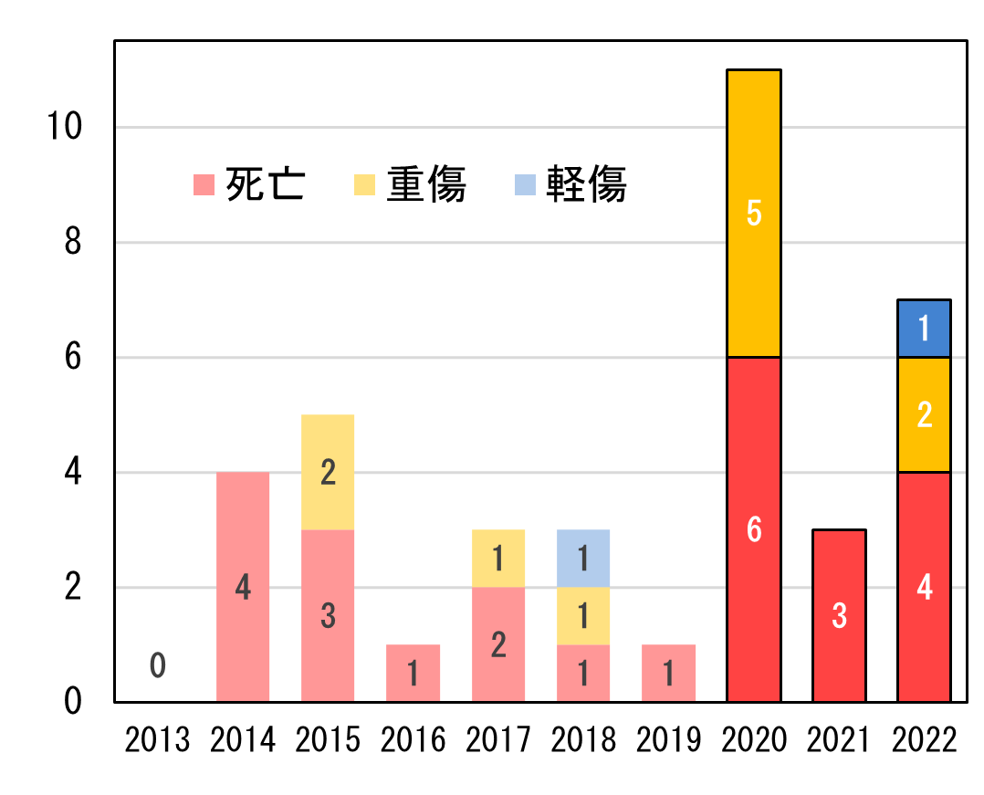 2013年度から2022年度までの10年間にNITEに通知された製品事故情報※1では、除雪機によりけがを負った事故は38件ありました。このうち21件が2020年度から2022年度までの間に発生したもので、ここ3年で事故発生件数が多くなっています。また、除雪機の事故38件のうち25件が死亡事故となっており、その多く(25件中21件)が、使用者の誤使用・不注意によるものです。