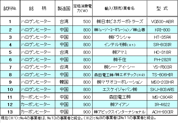 試買に当たっては、ヒーターの点灯が付属の赤外線リモコンで行えるリモコン付き電気ストーブを市場から幅広く購入に努め、合計13銘柄をテスト対象製品としました。これらはいずれも中国などで製造された輸入品でした。(テスト対象製品の事業者名・型式等は別添のとおり)