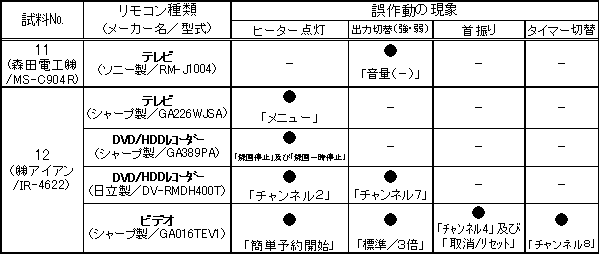 13試料のうち2試料(№11、№12)について、他の家電製品用リモコンとの組み合わせで、誤作動が確認されました。試料No.11については、出力切替(強・弱)の誤作動、試料No.12についてはヒーター点灯等の誤作動が認められました。