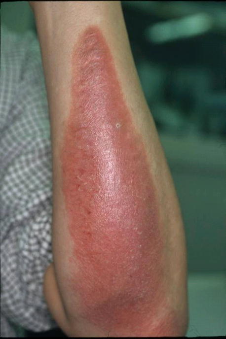 被害者は、塩化ビニル樹脂製のデスクマットを使用して、両前腕に皮膚炎を発症した。(写真参照)
