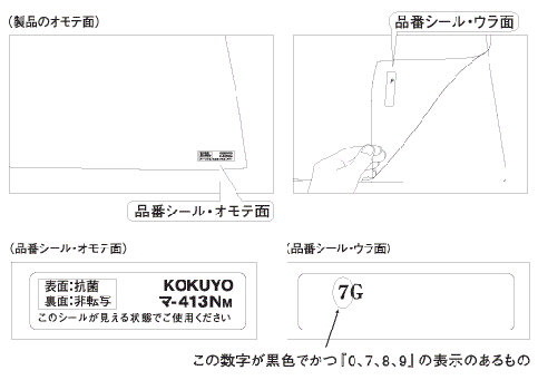 - 製品右下に貼られている品番シールの裏面に数字1桁とアルファベット1文字が表示されていますが、その数字が、7,8,9,0で、かつ黒色のもの
