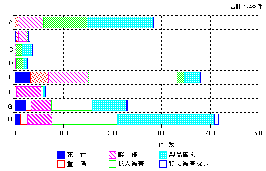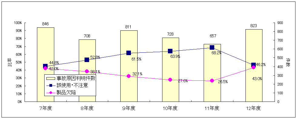 平成12年度中に寄せられた事故情報は1,469件です。このうち、事故原因が判明した事故の件数は823件であり、製品の欠陥に起因する事故の件数は354件です。