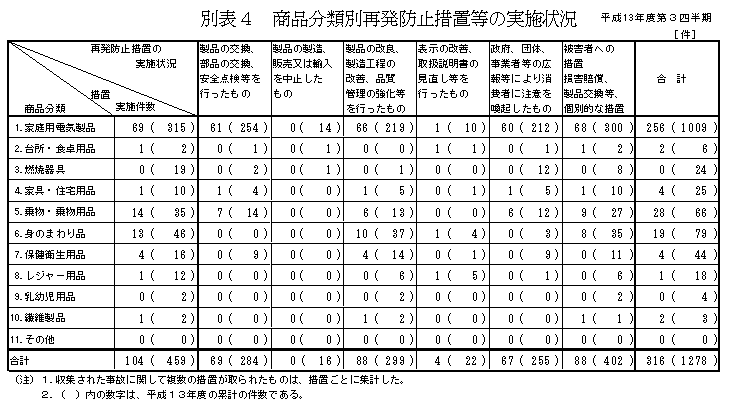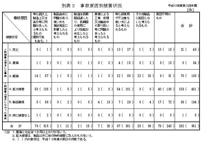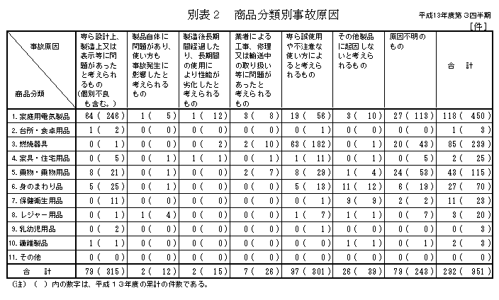 平成13年度第3四半期中に寄せられた事故情報は419件であり、そのうち事故動向等解析専門委員会(学識経験者、消費者団体等の外部有識者により構成)での検討を経て調査が終了し、事故原因が確定し、今回の公表に至った案件は292件でその概要は以下のとおりです。