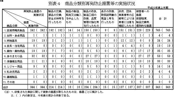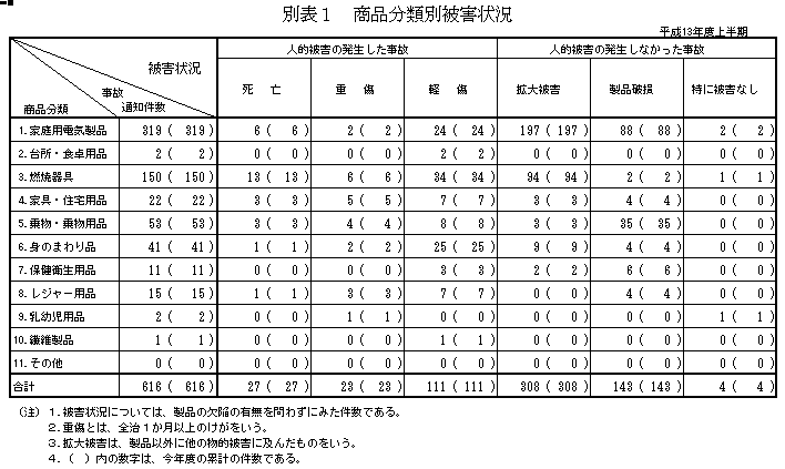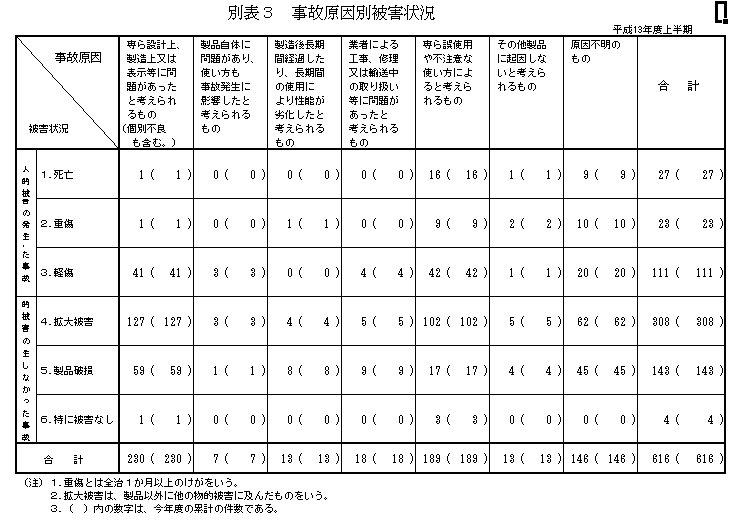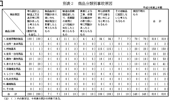 平成13年度上半期中に寄せられた事故情報は736件であり、そのうち事故動向等解析専門委員会(学識経験者、消費者団体等の外部有識者により構成)での検討を経て調査が終了し、事故原因が確定し、今回の公表に至った案件は616件でその概要は以下のとおりです。