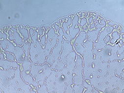 形細胞が二分裂によって増殖し、網状の細胞外細胞質と共に培地表面上を拡が