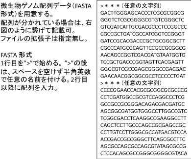 検索したい微生物のゲノム配列データをFASTA形式(注1)で準備してくだ