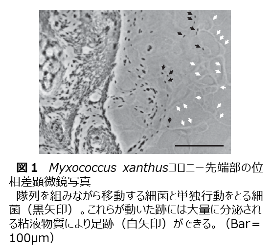 また、粘液細菌は多様な二次代謝産物の生産だけでなく、細菌でありながら多細胞生物 の様なユニークな形態をとる。あたかも戦国時代の隊陣の様に多くの細胞が秩序だった振 る舞いをする(図1)。一方で集団から外れ、明らかに単独で動いているように思われる 行動パターンをとる細胞も見られる。このような行動パターンをadventurous motility (A-motility)と呼ぶ。粘液細菌は他の微生物菌体や植物遺体(セルロース)といった一 般の細菌にとって利用しにくい固形の餌を好んで捕食するため、この餌を求めて、いくつ かの斥候のような細胞が存在すると考えられている。このA-motility細胞が微生物を求め て動き回り、餌に出会うと、後続の集団で動くsocial motility(S-motility)細胞群が この餌場に向かって集まってくる。どうやら先頭が餌と接触したという情報が、後方の細 胞集団に何らかの方法で伝達されているらしい。統制の取れた集団移動を行い、狩りをす ることから、粘液細菌コロニーはWolf pack(狼の群れ)と呼ばれている。