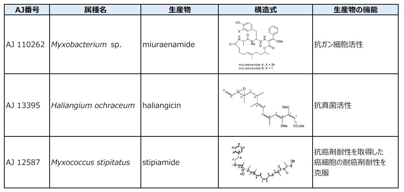 腫瘍物質miuraenamide生産Myxobacterium sp. AJ 110262、抗真菌物質haliangicin生産