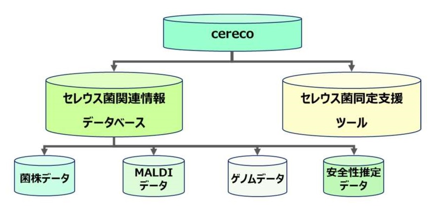 cerecoは、質量分析計によるセレウス菌グループの簡便な同定を支援するツールと、DBRPに登録されたセレウス菌関連情報の提供を行うシステムで構成されています。