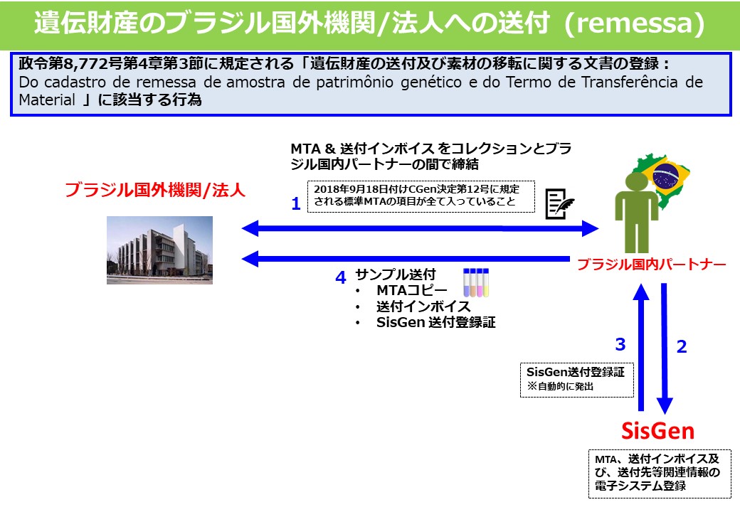 アクセスを目的とした、ブラジル国外の機関に対する遺伝財産のサンプルの移転を「送付 (remessa)」といいます。サンプルに係る責任は受取者であるブラジル国外機関が負います。「送付 (remessa)」には、以下の2つのケースがあります。