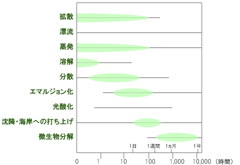 風化作用は、流出油の性質や気象条件、海水の状態によって大きく左右されますが、一般化すると、下図に示したような時間経過との関係になっています。