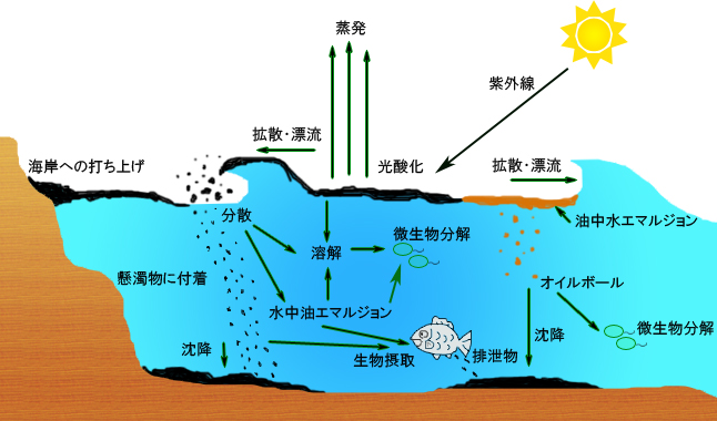 分散された油は表面積が大きくなり海水との接触面積が増大するため、微生物分解、溶解、沈降などの作用を受けやすくなります。