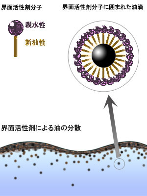 【図1】界面活性剤の分子構造と界面活性剤による油分散のしくみ
