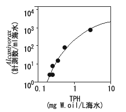 【図1】ナホトカ号で汚染された海域における油汚染(TPH)とAlcanivorax属細菌数との関係