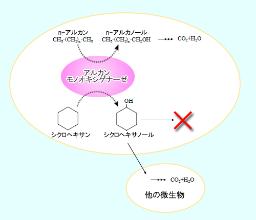 例えば、多くのアルカン分解菌が持っているアルカンモノオキシゲナーゼ(alkanemonooxygenase)という酵素は、n-アルカンに酸素を添加してn-アルカノールを生成します。 この反応は、n-アルカン分解の最初に起こる反応であり、生成されたn-アルカノールは、 この後、他の酵素によって順次酸化されていき、最終的には水と二酸化炭素に無機化さ れます。しかし、アルカンモノオキシゲナーゼの中には、n-アルカンだけではなく、シク ロアルカンにも酸素添加反応を起こすものも存在するのです。