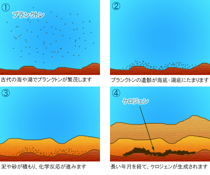 地表面が沈降して海や湖ができると、そこには水中に生息する生物や陸上から運ばれてきた生物の遺骸、泥や砂などが堆積します。生体を構成する炭水化物、タンパク質、脂質、リグニンなどの高分子物質は、生物の遺骸が堆積していく過程で、分解、重縮合、還元、環化などの反応によってケロジェンとなります。この過程は、主に微生物の作用によって行われると考えられています。埋没が進んで深度が深くなると、ケロジェンは地熱の影響を受けるようになります。地下の温度は深度とともに上昇し、100m下がるごとに約3℃上昇します。地下深くに埋没したケロジェンは、長い年月の間に地熱によって熱分解され、その過程で石油が生成されるようになります。