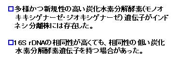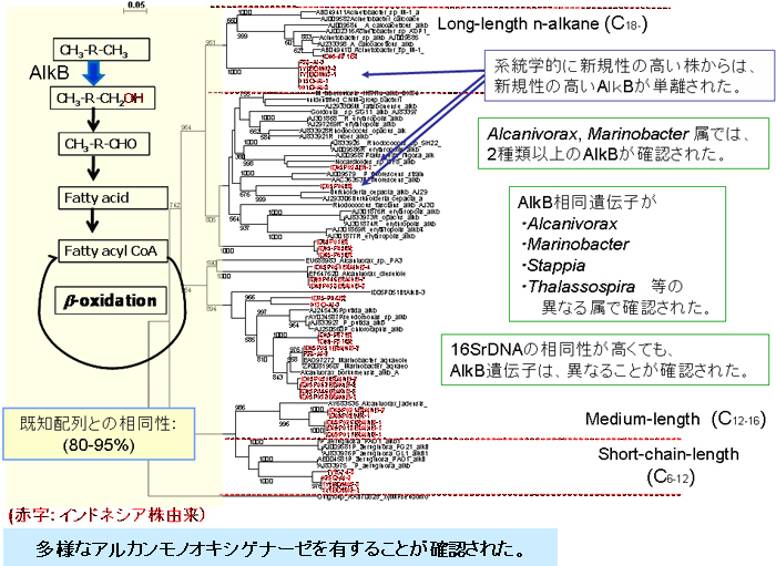 インドネシアで分離した石油分解菌について、炭化水素分解の初発反応を触媒する酸素添加酵素遺伝子の塩基配列を解析しその結果、多様かつ新規性の高い炭化水素分解酵素(モノオキシゲナーゼ・ジオキシゲナーゼ)遺伝子が存在していました。また、16S rRNA遺伝子の相同性が高くても、相同性の低い炭化水素分解酵素遺伝子を持つ場合がありました。