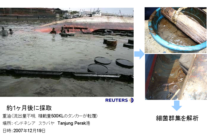 インドネシア、スラバヤのTanjung Perak港で起きた重油流出事故の流出油を採取し、その細菌群集構造を解析しました(【図7】)。