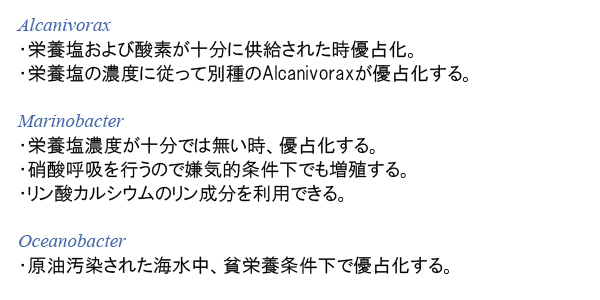 Alcanivoraxは、栄養塩及び酸素が十分に供給されたとき優占化します。Marinobacterは、栄養塩濃度が不十分なときに優占化します。この細菌は、硝酸呼吸を行うので嫌気的条件下でも増殖します。また、リン酸カルシウムのリン成分を利用できます。Oceanobacterは、原油汚染された海水中、貧栄養条件下で優占化します。 なぜ特定の石油分解菌が特定の条件で優占化するのかの理解は、緒についたばかりです。このメカニズムを完全に理解することで、状況に併せて、特定の石油分解菌を環境浄化に利用するような技術も開発できるでしょう。