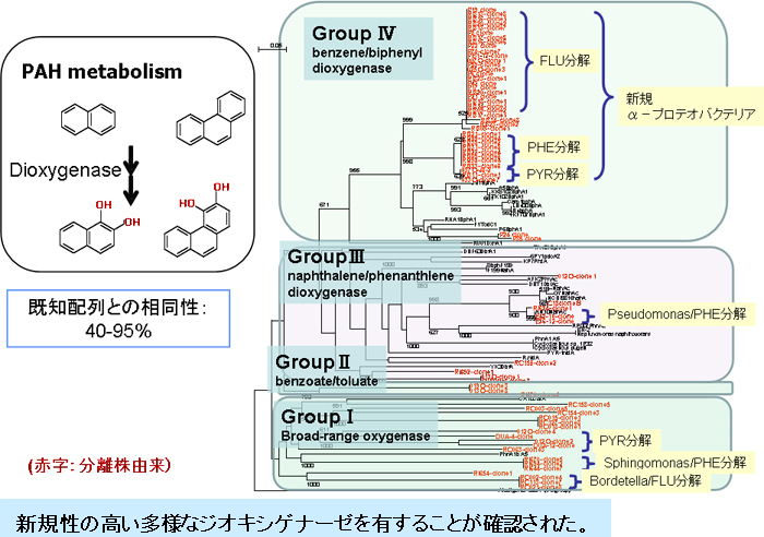 PAH分解細菌のうち、選別した300株について、芳香環への初発の酸化反応を担う二酸素原子添加酵素(ジオキシゲナーゼ)遺伝子をPCRによって増幅しました。184株で増幅が確認され、このうち70株についてクローニングを行いました。その推定アミノ酸配列の相同性検索をblastxによって行ったところ、既知のジオキシゲナーゼ配列に対し、約40~95%の相同性を示しました。 系統解析の結果、これまでに知られている4種類すべてが確認され、インドネシアPAH分解菌株の保持するジオキシゲナーゼは、アルカン分解細菌の場合と同様に多様性に富んでいました。しかし、実験に供した菌株のうち約半数については、既報の6種類のプライマーを用いたPCRにおいても増幅が見られませんでした。このことからインドネシア株には、既報のものとは異なる新規性の高いジオキシゲナーゼが存在することが示唆されました。特に、Alphaproteobacteriaの系統学的に新規性の高い株においては、そのジオキシゲナーゼの新規性が高いことがわかりました。(【図2】)。