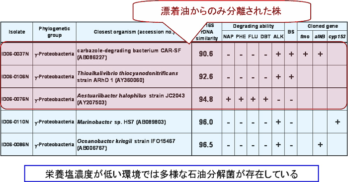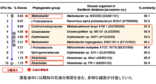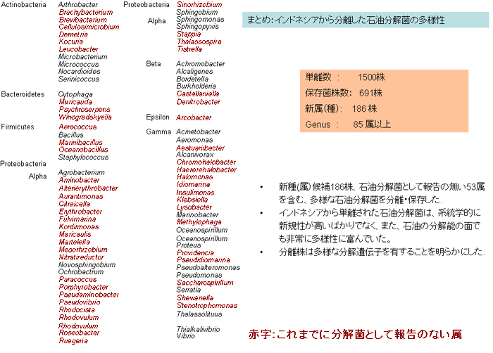 - 原油流出事故での流出重油中でAlcanivorax属、Marinobacter属及びOceanobacter属が高い比率で存在し、これらの細菌がインドネシア海域での石油分解に重要であると考えられます。