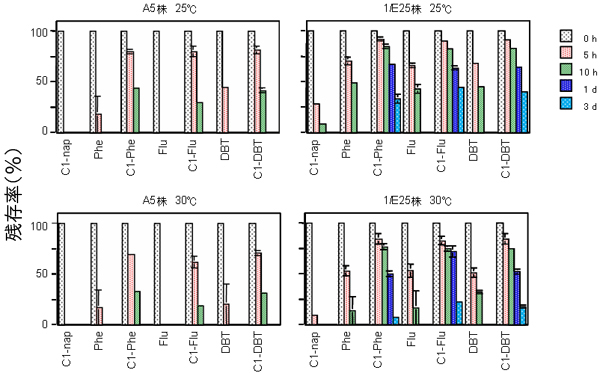 インドネシア海水から分離された芳香族炭化水素分解細菌の中で、高い分解能力をもっていると予想されたのが、Altererythrobacterに類縁の、1/E25株です(【図6】)。この株の原油中の芳香族炭化水素の分解能力を、温帯から分離されたCycloclasticus属 A5株の分解能力と比較したところ、Cycloclasticus属の方が高いことが分かりました(【図7】)。