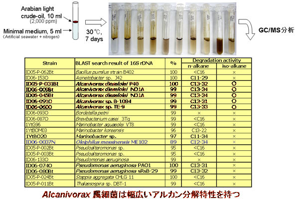 - インドネシア海水から分離できなかったOceanobacterは、Alcanivoraxと同等のn-アルカン分解活性を示しました。