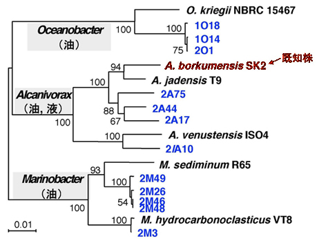 本調査で新規に分離した菌株のアルカン分解活性を30℃で測定し、 Alcanivorax の基準株であるA. borkumensis SK2株の活性と比較しました。原油乳化能力はほとんどすべてのAlcanivorax属の菌株で検出され、そのほかの属の菌株からは検出されませんでした。Oceanobacter属関連株は、直鎖アルカンの分解に関して、A. borkumensis SK2と同等の高い活性を示しました。Alcanivorax 属の菌株も、2lA10株を除外してA. borkumensis SK2と同等の活性を示しました。Marinobacter sp. 2M3は最も低い直鎖アルカン分解活性を示しましたがMarinobacter属類縁株 2M26、2M46、2M48、2M49は Alcanivorax sp. 2lA10よりも高い直鎖アルカン分解活性を示しました。分岐鎖アルカンの分解に関しては、すべてのAlcanivora 属細菌が分解活性を示す一方、Oceanobacter 関連株やMarinobacter 属細菌では検出されませんでした。したがって、Alcanivorax 属細菌は、温帯海域の石油分解の研究で既に報告されているように、熱帯海域でも重要な分岐アルカン分解細菌であることが考えられます。