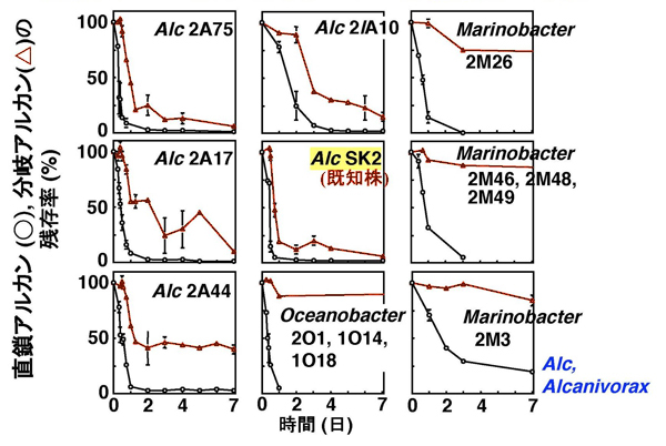 - Alcanivorax のみが、分岐鎖アルカンの分解能力をもっていました。