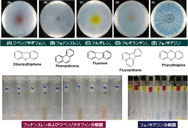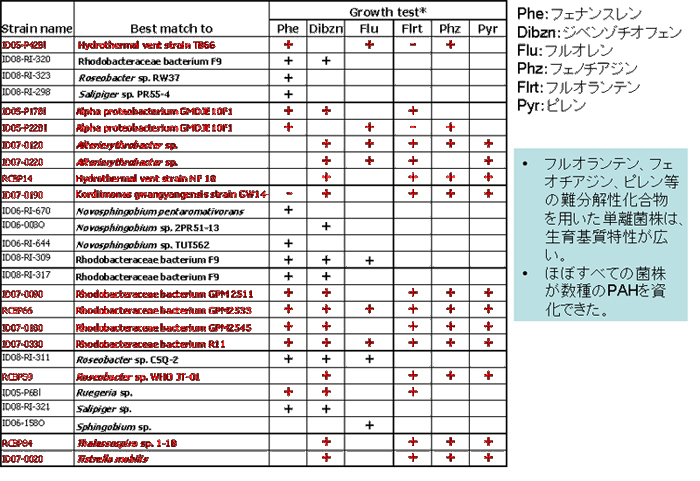 - フルオランテン、フェノチアジン、ピレン等の難分解性化合物を用いた単離菌株は、広い生育基質特性を持っていました。