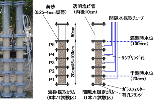 間隙水採取用カラムは、最上部カラム以外の、海砂を充てんする5個の個別カラムの中央部にサンプリングポート(サンプリング孔)を設け、シリコンチューブを接続し、このチューブを通じて個別カラム内の間隙水をシリンジで採取できる構造です。