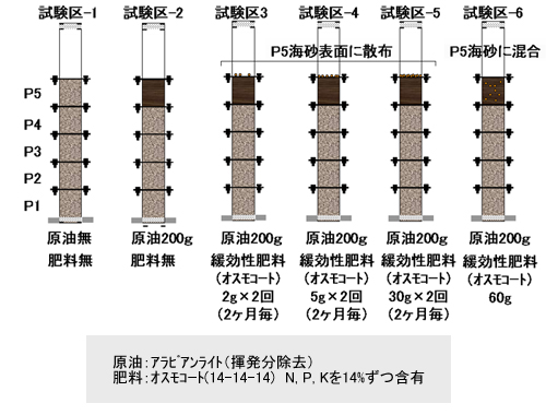 1基のヒューム管には、同条件で作成した海砂採取用カラム6本と間隙水採取用カラム1本を設置し、6基のヒューム管ごとに異なる試験条件を設定しました(【図4】)。試験区-1は、原油及び緩効性肥料を添加しないコントロール条件とし、試験区-2は、原油のみ添加する条件としました。試験区-3~試験区-6は、緩効性肥料の添加量や添加方法について異なる条件を設定し、肥料の適切な供給方法を把握しました。