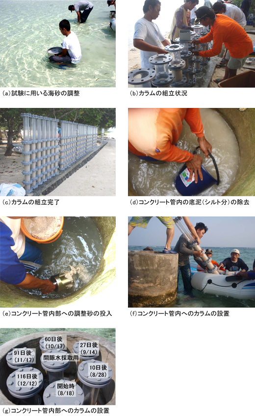 カラムに充てんする海砂は、パリ島沿岸に堆積している天然海砂を清浄な海水を用いてふるい処理して得られる0.25~4mmの範囲内の調整砂を使用しました(【図5】(a))。