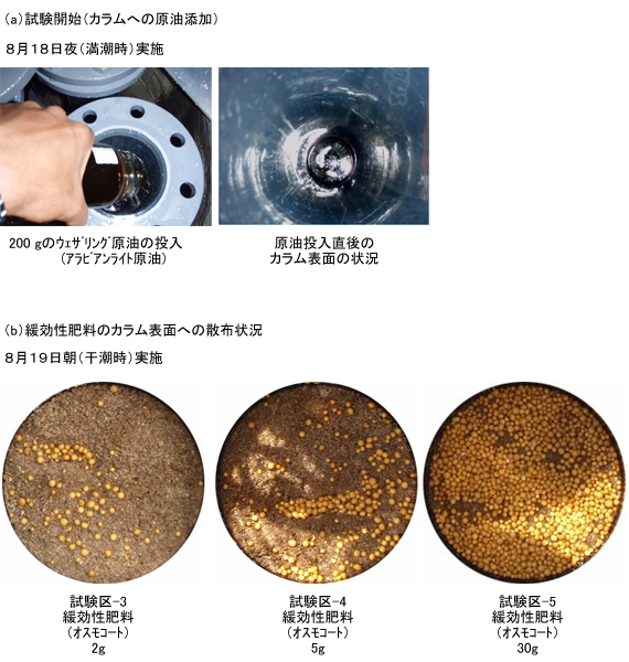 カラム内の海砂上面より海水面が約2cm高くなった2008年8月18日の満潮時(23時頃)に、試験区-1を除くすべての中空カラム内に前記の原油を200gずつ投入しました。(【図6】原油と緩行性肥料の添加 (a))。原油投入から10時間後に、海砂上面に投入した原油が砂中に浸透していることを確認後、試験区-3、試験区-4、試験区-5を対象として緩効性肥料をカラム内の海砂上面に添加しました。試験開始から2か月後の海砂採取用カラムの回収時に同様の方法で追肥しました。添加直後のカラム内の海砂表面の状況を【図6】原油と緩行性肥料の添加 (b)に示します。