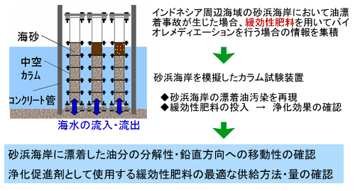 - 砂浜海岸に漂着した石油のバイオスティミュレーション処理による浄化効果と地中鉛直方向への移動性(汚染拡散状況)の確認。