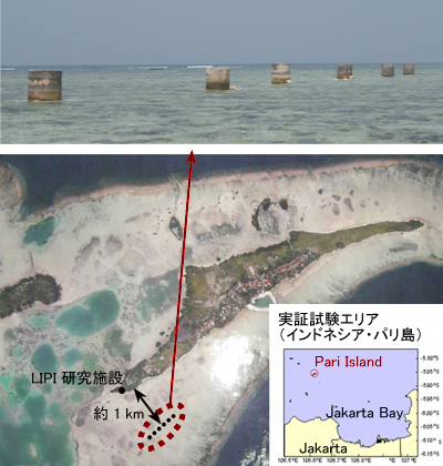 実証試験サイトをインドネシア、ジャカルタ湾沖に位置するパリ島に設けました。パリ島は、南北に長い周囲約5kmの有人島(人口約700人)です。島の西端にインドネシア科学院(LIPI)の分室があり、そこから約1km沖の礁湖に、ヒューム管(コンクリート管)を6基据え付けて、その中に中空カラムを設置しました(【図2】)。外海の波が高いときでも礁湖は比較的波が低く、試験の安全を確保できます。また、ヒューム管と中空カラム内を用いることにより、周辺海域の汚染を防ぐことができます。