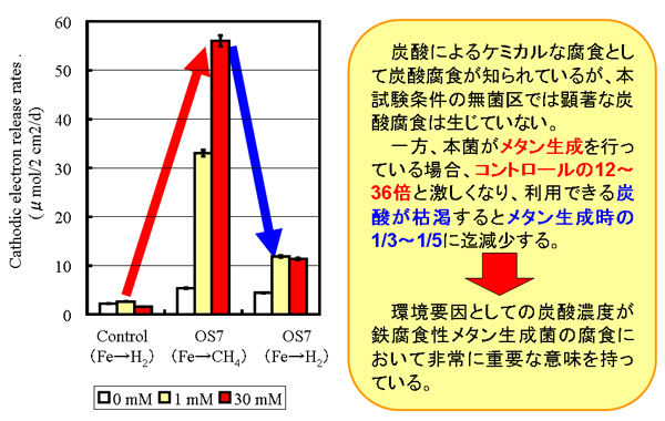 炭酸による化学的な腐食が知られていますが、本試験条件の無菌対照区では顕著な炭酸腐食は生じていません。一方、鉄腐食性M. maripaludisがメタン生成を行っている場合、鉄の腐食速度は無菌対照区の12~36倍であるという結果が得られました。しかし、利用できる炭酸が枯渇すると、その腐食速度はメタン生成時の1/3~1/5にまで減少します。すなわち、環境要因としての炭酸濃度が鉄腐食性M. maripaludisの腐食において非常に重要な意味をもっていると考えられます。