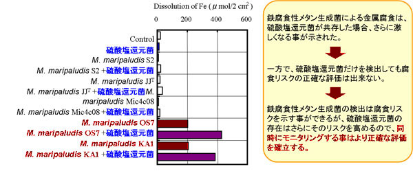 微生物腐食は硫酸塩還元菌によって起こるという通説が業界では余りにも有名であるため、現場で硫化水素と硫酸塩還元菌が検出されると、硫酸塩還元菌による腐食だろうと安易に判断されていました。しかし、本調査での原油タンク底水での鉄腐食菌の探索において強い鉄腐食の誘因となる硫酸塩還元菌は見出されず、鉄腐食性M.maripaludisが高頻度で分離されました。このため、激しい腐食を誘導する本微生物の特異的及び定量的な検出は、原油タンクにおける微生物腐食のリスク判定に重要であると考えられます。また、硫酸塩還元菌は直接的に鉄腐食の原因とはならないが、鉄腐食性M. maripaludisと共存することで、より強い鉄腐食が起こることも新たな知見として得られました。
