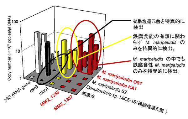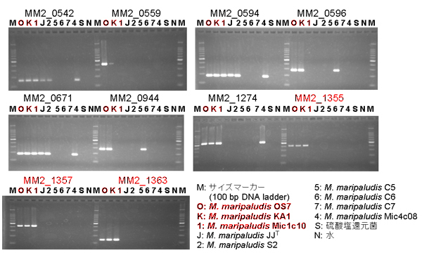 これまでに述べた調査の結果、鉄腐食性M. maripaludis を3株分離しました(KA1株、OS7株、Mic1c10株)。一方、同じM. maripaludis でも株レベルで鉄腐食能に違いが見受けられ、既知株等(JJT株、S2株、C5株、C6株、C7株、Mic4c08株)では鉄腐食を誘導しないことが判りました。このため、鉄腐食性M. maripaludis のみを検出する必要があります。「M. maripaludis の腐食機構」の解明において腐食遺伝子が推定されたので、この領域のORFをPCR増幅することにより鉄腐食性M. maripaludis の特異的検出を試みました。この結果、腐食遺伝子領域のORFのみ(MM2_1355、MM2_1357、MM2_1356)が鉄腐食性M. maripaludisで検出され、硫酸塩還元菌を含むそれ以外の微生物から本領域はPCR増幅されませんでした(【図2】)。