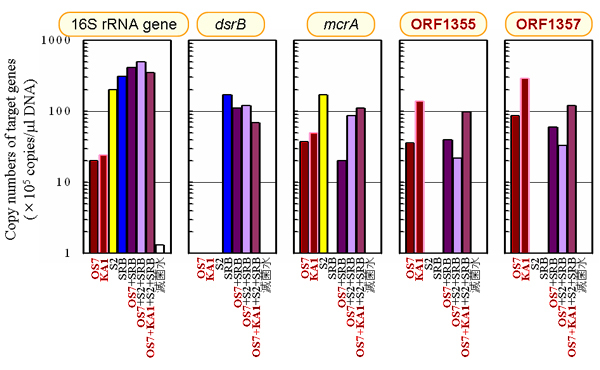 上記で述べた腐食遺伝子領域のORFを定量的PCR増幅することにより、鉄腐食性M. maripaludisの定量的な検出を行いました【図3】。また、細菌や古細菌の全量を見るために16S rRNA遺伝子の増幅も行いました。これ以外に、PCR増幅によるM. maripaludisを含むメタン生成古細菌全般の検出に関してはメタン生成機構に関与するメチルCoMレダクターゼをコードする遺伝子領域(mcrA)を、PCR増幅による硫酸塩還元菌の特異的検出に関しては一般的に用いられる異化的亜硫酸還元酵素をコードする遺伝子領域(dsrAB)を標的遺伝子として使用しました。その結果、腐食性M. maripaludisを含むすべての特異的な標的遺伝子で、それぞれの微生物を特異的に検出することが出来ました。この定量的PCRは、単純な単一微生物由来DNAのみでなく、より高度な複合微生物由来DNA(腐食性M. maripaludisを約1/10量含む)においても再現性があり【図4】、実環境でも適用可能であると考えられます。