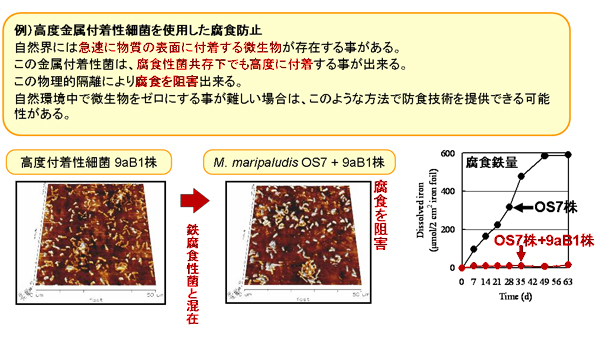 微生物腐食の防食技術の開発に関して、二つのアプローチを検討しました。自然界には急速に物質の表面に付着する微生物がまれに存在し、本調査では10分程度で金属表面を覆いつくす程の高度付着性細菌を分離しています。この微生物を鉄腐食菌と混在させたとき、金属表面に急速に付着し物理的保護となって腐食を阻害する現象が確認されています。このような微生物を防食技術に応用することができるかもしれません。