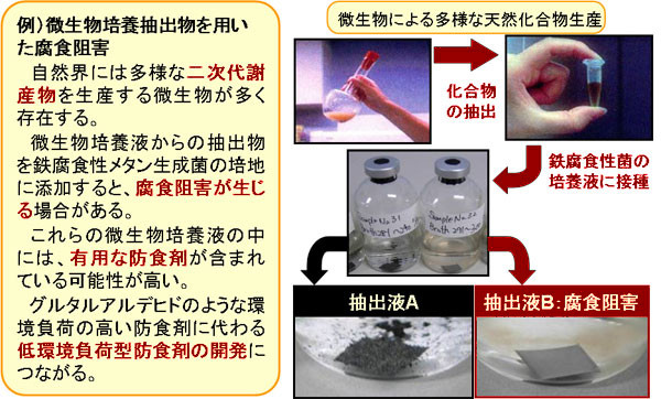 自然界には多様な二次代謝を行う微生物が多く存在することが知られており、独立行政法人製品評価技術基盤機構(NITE)ではこのような微生物を含む膨大な微生物コレクションを保有しています。本調査の中でもこのNITEの微生物コレクションの一部を用いて簡易スクリーニングを行った結果、微生物培養液からのアセトン抽出物を鉄腐食菌の培養液に接種することで腐食阻害を誘導できることが示されました。このような微生物由来天然化合物は、使用実績のあるグルタルアルデヒドのような、環境負荷の高い防食剤に代わる低環境負荷型防食剤の開発につながることが期待されます。