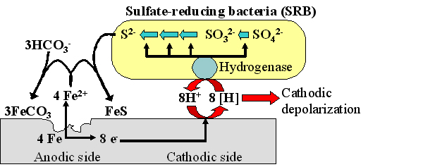 1934年、Von Wolzogen KuhrとVon der Vlutによって、嫌気的環境下で硫酸塩還元菌が微生物腐食を引き起こす可能性が報告されました。そして、この硫酸塩還元菌による腐食は、【図1】に示された陰極脱分極反応(cathodic depolarization theory)によって起こると説明されました。しかし、最近の研究から、この説は疑問視されるようになっています。