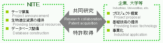「生物遺伝資源の産業利用促進に係る共同研究事業」として、NITEバイオテクノロジー分野が持つ研究シーズに対する情報の高付加価値化を図ることを目的に、それらのシーズを活用して、生物遺伝資源の有用機能を産業利用へと結びつける研究を促進させる、産学官の連携による共同研究を実施しました。 これにより、バイオテクノロジー分野の研究開発を促すだけでなく、生物遺伝資源利用の実用化を目指し、社会が成果の恩恵を十分に享受できるようにするための仕組みを構築します。