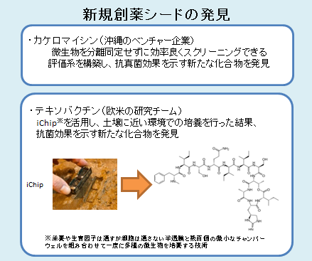 - 微生物の生産する化合物が創薬シードとして探索されてきたが、長年の探索により新規母核を有する化合物の発見が減少し、多くの企業が微生物からの創薬シード探索から撤退