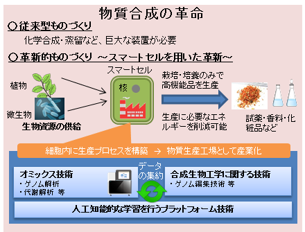- 多様な生物資源の供給基盤、オミックス技術、合成生物工学に関する技術の融合により、「スマートセル」※を作成