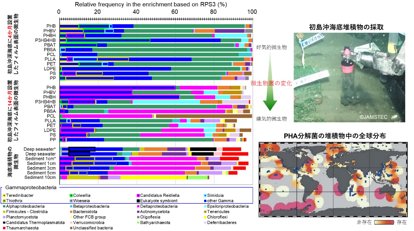 - 今回、菌叢解析(16S rRNA遺伝子アンプリコンシーケンシング(注4))およびメタゲノム解析(注5)により、深海から生分解性プラスチックを分解できる新たな分解微生物を多数発見することにも成功しました。さらに、発見した分解微生物は、世界中のさまざまな海底堆積物(注6)にも生息していることが明らかになり、分解が実証された生分解性プラスチックは、世界中のいずれの深海でも分解されると考えられます。