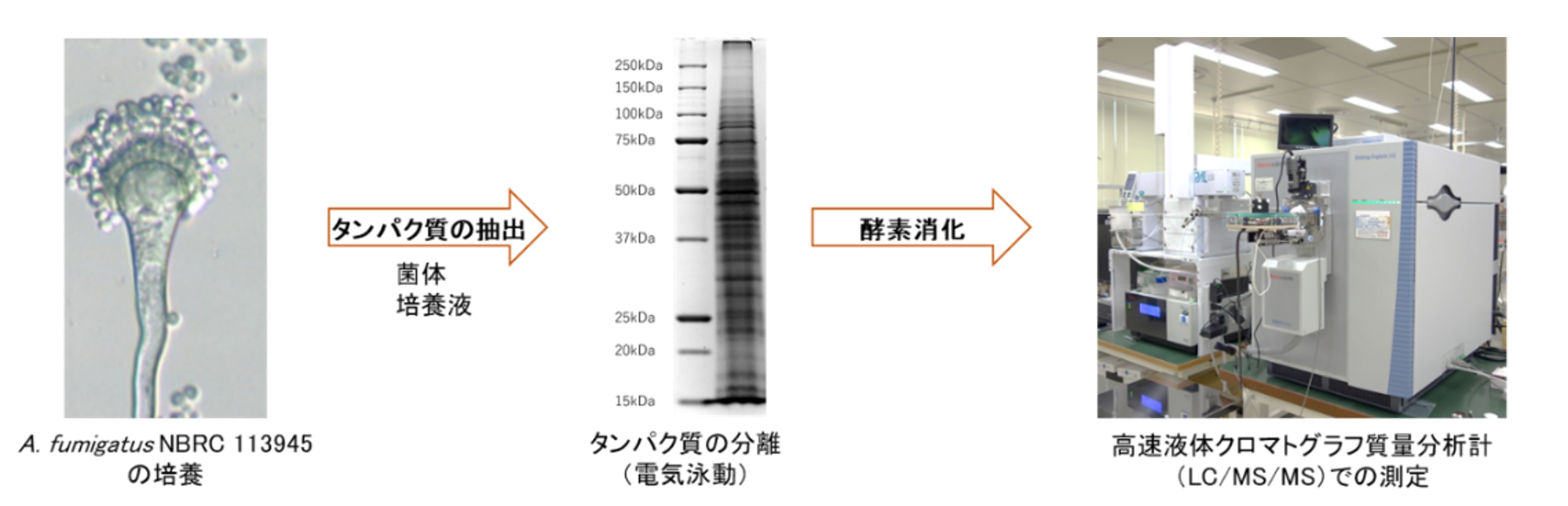 - 人に対して病原性を持つ Aspergillus属を含む複数のカビがエアコンから分離・同定されNBRCに寄託されました。 プロテオーム解析※3では、寄託された菌株から選定した A. fumigatus NBRC 113945を培養し、菌体および培養液からタンパク質を抽出して酵素消化したサンプルを高速液体クロマトグラフ質量分析計(LC/MS/MS)で測定し、タンパク質を同定しました(図1)。実際に菌体と培養液から検出されたタンパク質やアレルゲンの情報はDBRPからダウンロードできます。 また、NBRCオンラインカタログから A. fumigatus NBRC 113945 を入手し、追加の研究を行うことも可能です。