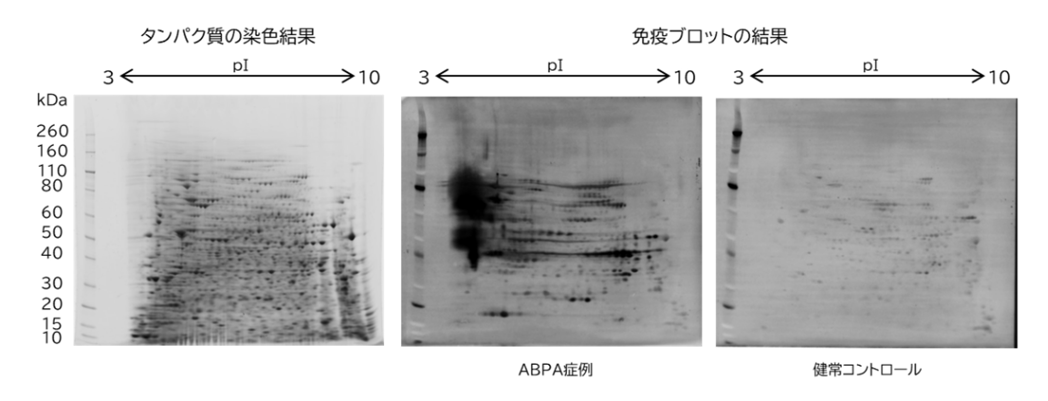図2 A.fumigatus のアレルゲン解析例- A.fumigatus のタンパク質を二次元電気泳動法で分離し、免疫ブロットによりアレルゲンを検出。