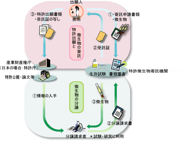 つまり、出願人は微生物を所定の機関に寄託することによって微生物の存在(発明の完成)を証明し、当該機関は寄託された微生物を第三者に分譲することによって発明の再現(技術の公開)を保証するのです。